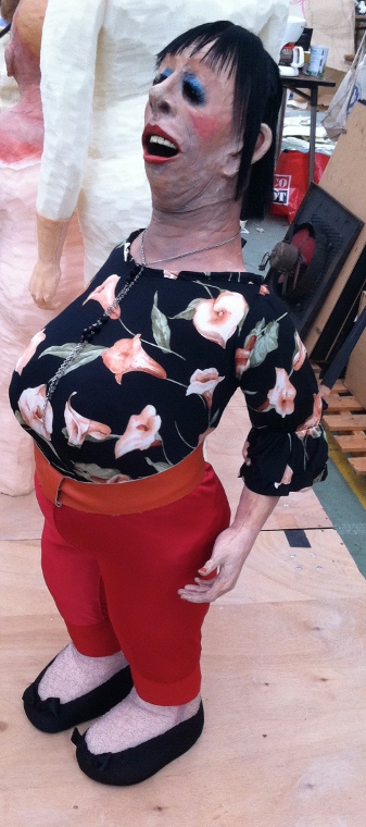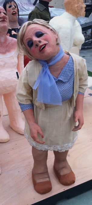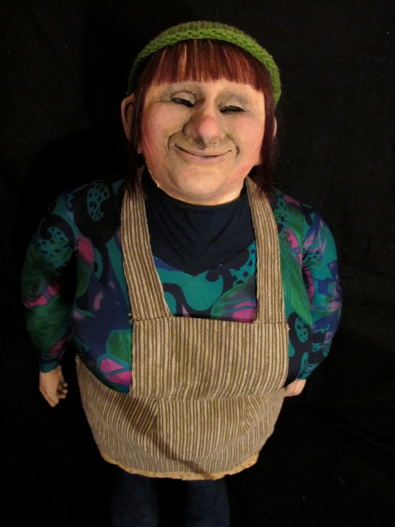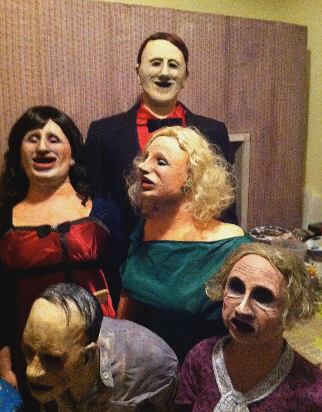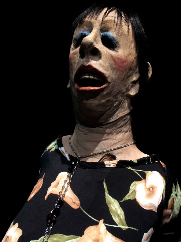 A partir des marionnettes crées par Anthonin Lebrun, l’élaboration des coiffures, costumes et accessoires, s’est fait en fonction de chaque rôle comme on le ferait avec des comédiens. Les visages et les mains ont été modelés en argile puis moulés en latex et les corps sculptés dans une mousse latex. Les dimensions sont variables: de 1,70m à 30cm. Le but étant de donner vie à chaque personnage, une « personnalité » qui lui est propre et correspondant à l’esprit du texte. Les costumes sont de type réaliste (coupe, matières) mais accentués par des couleurs vives ou des imprimés criards. L’idée étant de mettre en relief et en opposition la relation de la comédienne avec ces marionnettes. Dans certain cas les imprimés sont peint à la main pour un aspect patiné et démodé, qui correspond mieux aux personnages. Les perruques en cheveux véritables et synthétiques sont cousues à la main, coiffés et mis en forme selon l’allure souhaitée. L’idée étant de donner à ces marionnettes une allure de « fantômes » du quotidien (qu’on pourrait croiser dans la rue), au milieu desquels se débat le personnage joué par la comédienne.